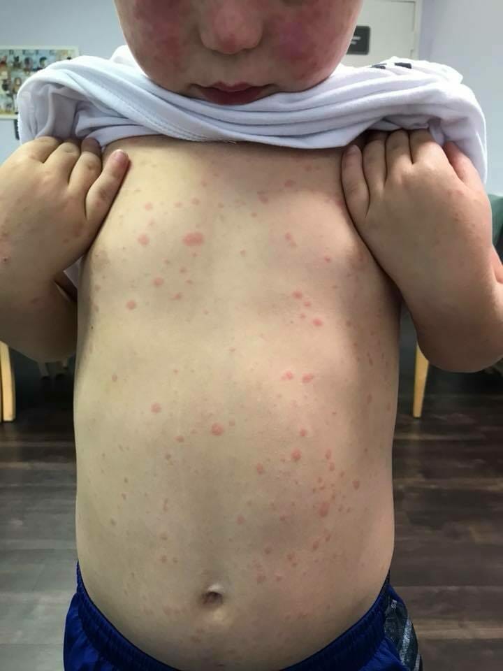 הילד פיתח פריחה, היה לו חום וכאבי בטן.