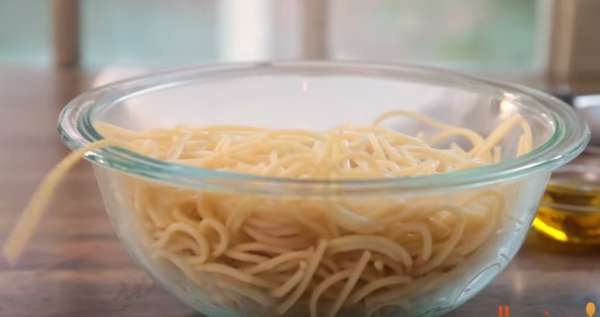 בשלו את הפסטה עד שהיא אל דנטה (כ 7 דקות), לאחר מכן העבירו אותה לקערה, וערבבו עם כפית וחצי של שמן זית