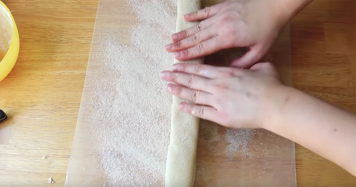 3. פזרו את הסוכר על נייר אפייה וגלגלו את הבצק לצורת גליל