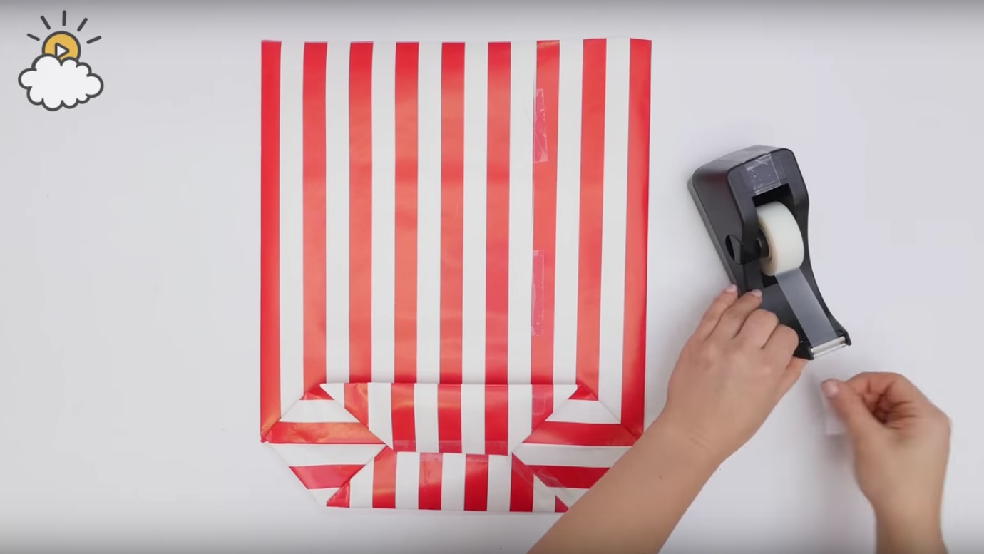 ברגע שהמתנה נמצאת בתיק, קפלו את החלק העליון של התיק אחורנית. ואז, נקבו שני חורים בקפל. חזקו את התיק החדש עם סרט על ידי השחלתו בחורים וקשרו אותו בצורה יפה.